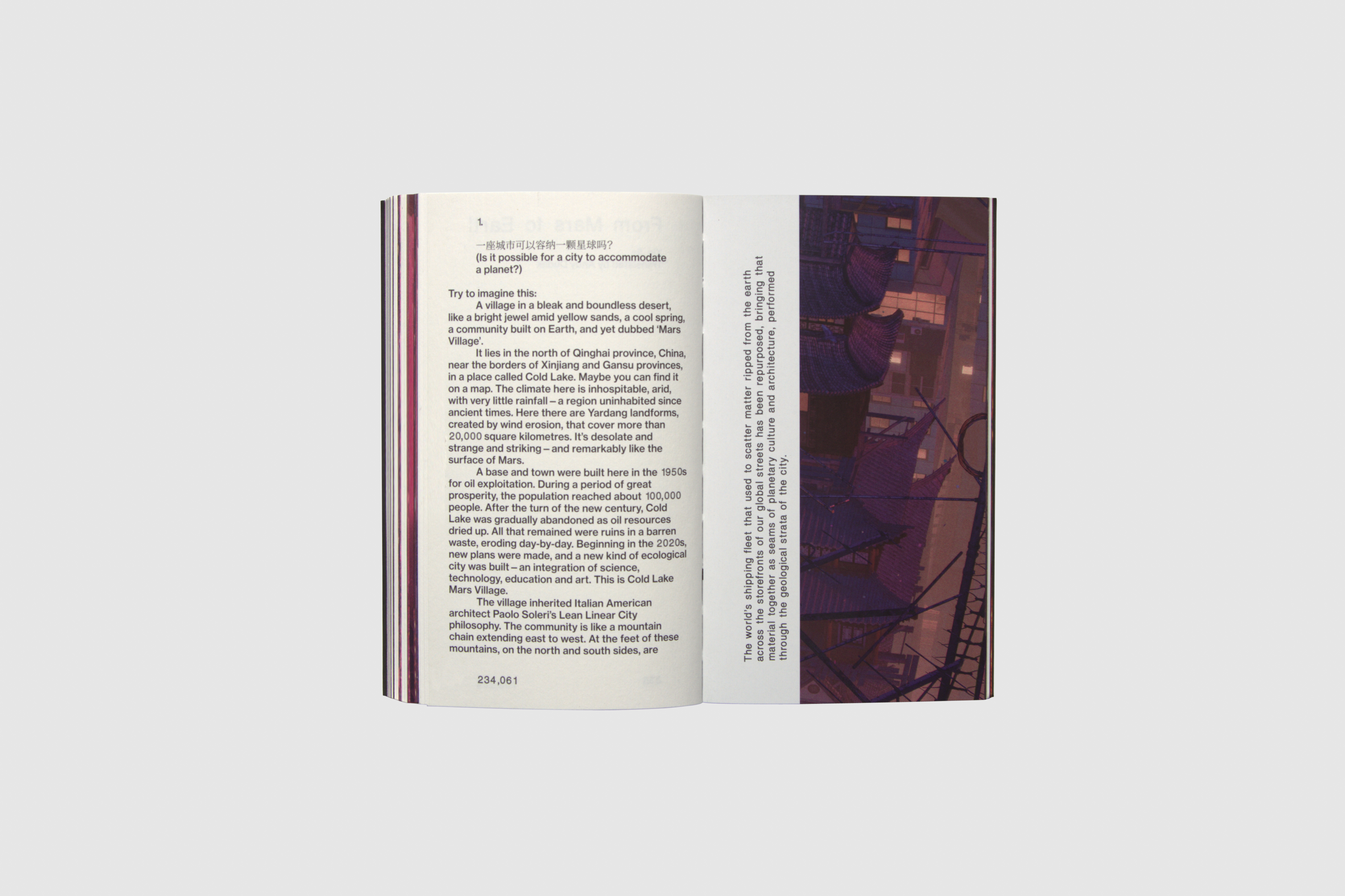 The book features original short stories set within the city by American climate fiction author Kim Stanley Robinson, Chinese sci fi writers Stanley Qifan Chen and Xia Jia, Caribbean Canadian author Nalo Hopkinson, indigenous Australian comic creator and director of the Cleverman TV series Ryan Griffen and essays from urbanists Saskia Sassen, Ben Bratton and Ashley Dawson, Environmental social scientist Holly Jean Buck, ecological economist Giorgos Kallis, architects Amaia Sanchez-Velasco and Andrew Toland and curator Ewan McEoin with book design by Stuart Geddes.
